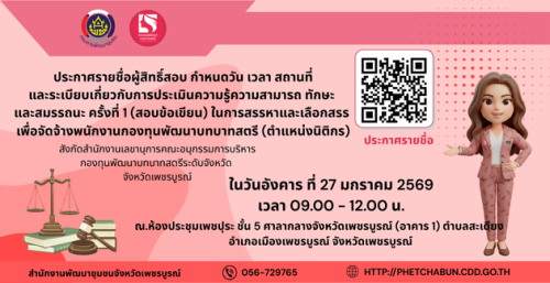 สำนักงานพัฒนาชุมชนจังหวัด ประกาศรายชื่อผู้มีสิทธิ์สอบ กำหนดวัน เวลา สถานที่ และระดบียบเกี่ยวกับการประเมินความรู้ความสามารถ ทักษะ และสมรรถนะ ครั้งที่ 1 (สอบข้อเขียน) ในการสรรหาและเลือกสรรเพื่อจัดจ้างพนักงานกองทุนพัฒนาบทบาทสตรี (ตำแหน่งนิติกร)