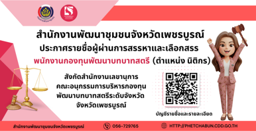 สำนักงานพัฒนาชุมชนจังหวัดเพชรบูรณ์ประกาศรายชื่อผู้ผ่านการสรรหาและเลือกสรรพนักงานกองทุนพัฒนาบทบาทสตรี สังกัดสำนักงานพัฒนาเลขานุการคณะอนุกรรมการบริหารกองทุนพัฒนาบทบาทสตรีระดับจังหวัด จังหวัดเพชรบูรณ์ (ตำแหน่งนิติกร)